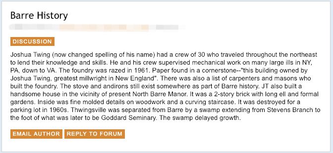 Others have found the forum to be an ideal platform for contributing to the community in other ways. Since retiring as a teacher in Barre, Vermont in 1998, Nancy Wolfe explained that she saw a distinct lack of hometown pride in her central Vermont city, a blue-collar town that’s earned a reputation for crime and drugs in recent years. Several years ago, she began a home-brewed research project into the city’s storied history in an attempt to inject some civic pride into her neighbors. Attempts to hold a series of talks never yielded a good turnout, but she found that the city’s forum provided an ideal venue for her efforts. She broke her work into small, manageable chunks, and began posting it — a paragraph at a time, a couple of times a week, sharing the town’s history of granite mining and sculpting.