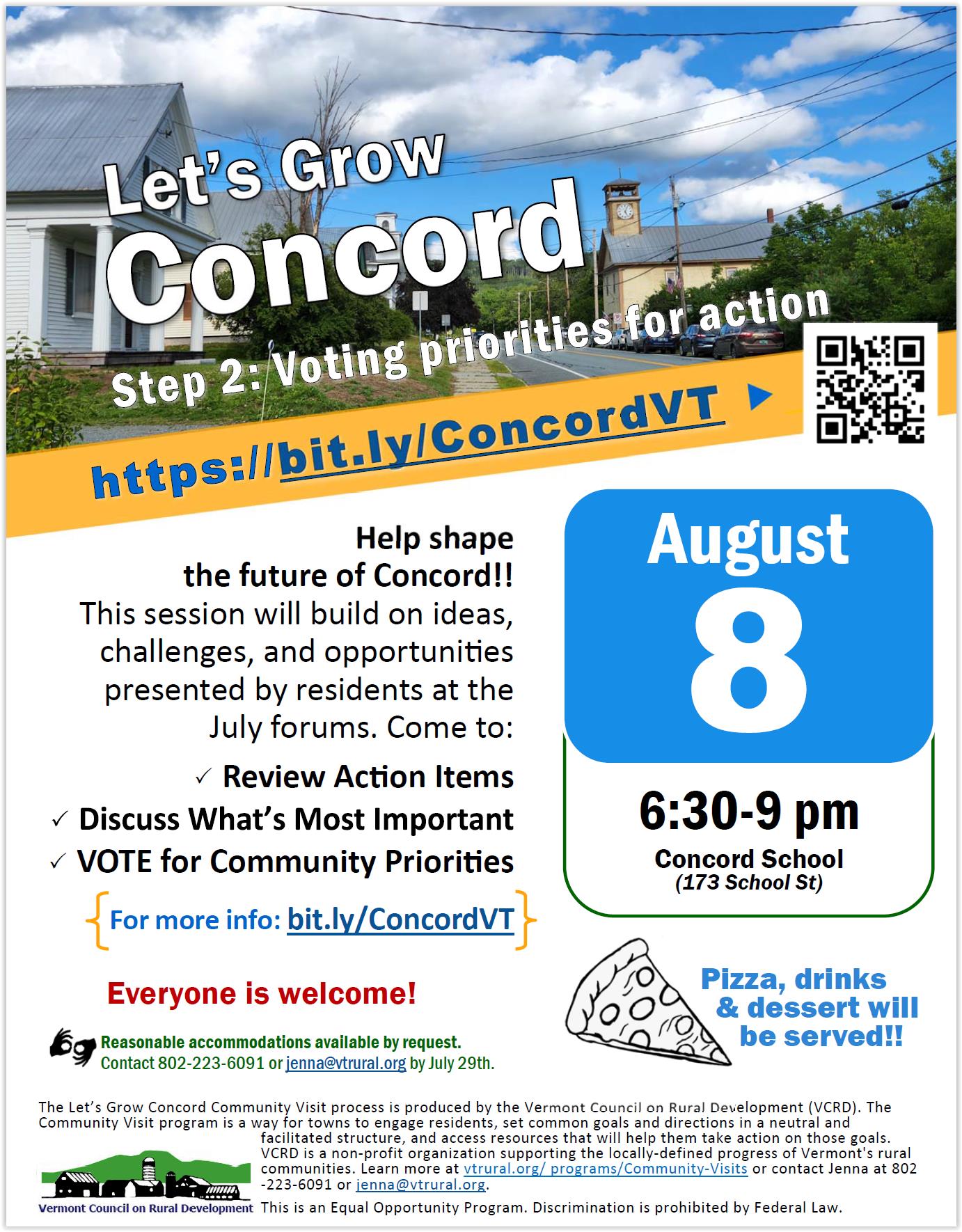 The "Let's Grow Concord" Community Visit is a 3-month process that brings community members together to actively participate in examining issues, decide top priorities and develop action plans for the future of the town. The Vermont Council on Rural Development provides the overall structure and neutral facilitation each step of the way.