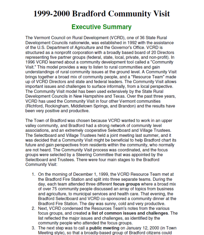 Through the Community Visit process in Bradford, Village revitalization was boosted with library repairs, the development of Boch park, and ongoing affordable housing efforts. Work was also made towards a town/village merger. Read the Report and Action Plan