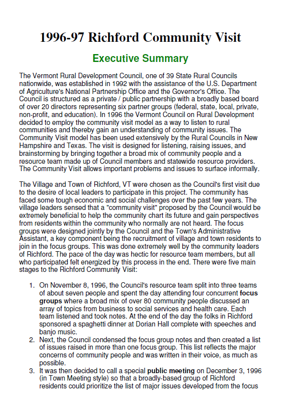 Through this community visit process, Richford merged the village & town; built affordable housing, as well as river paths, and a new health center, and created plans to redevelop Sweat‐Cummings downtown industrial plant. The town also charted millions in grants in support of Community Visit Task Force action plans. Read the Report and Action Plan