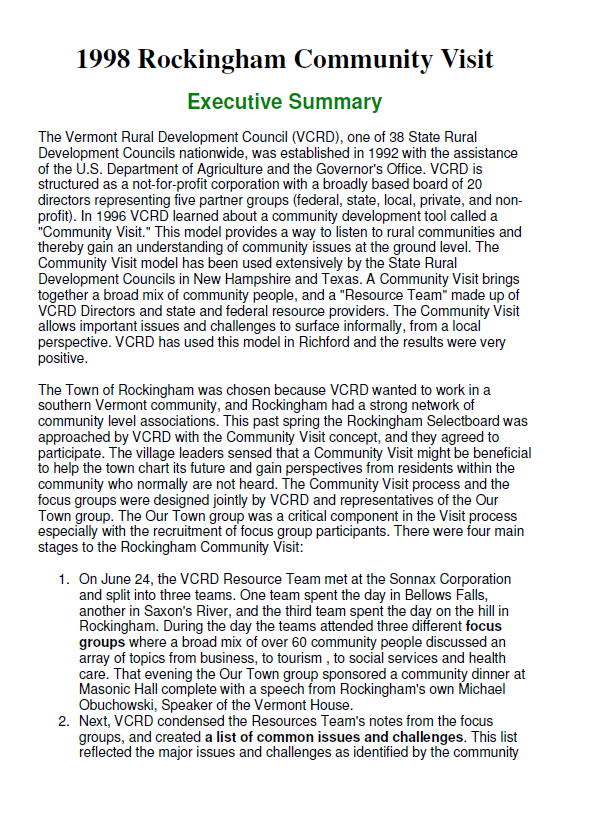 Through this community visit process, Rockingham accomplished its goals of creating more downtown housing, working towards a downtown revitalization, and rebuilding the Bellows Falls image. Today the reborn downtown is a model of creative economy development. Read the Report and Action Plan