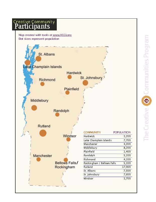 In 2006-2007, with major support from Jane’s Trust, VCRD piloted the Creative Communities Program (CCP) to offer an opportunity for towns, villages, and cities around Vermont to use a public participation process to explore ways of combining local culture, community, and commerce for a strong economic future.