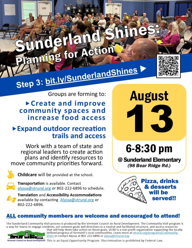 Through the “Sunderland Shines” process, the community came together to identify and prioritize goals, foster local leadership, connect to resources and develop and realize achievable action plans. Through 3 public meetings, community members chose two priorities for action, and signed up for task force groups to move them forward. The new task force groups will…